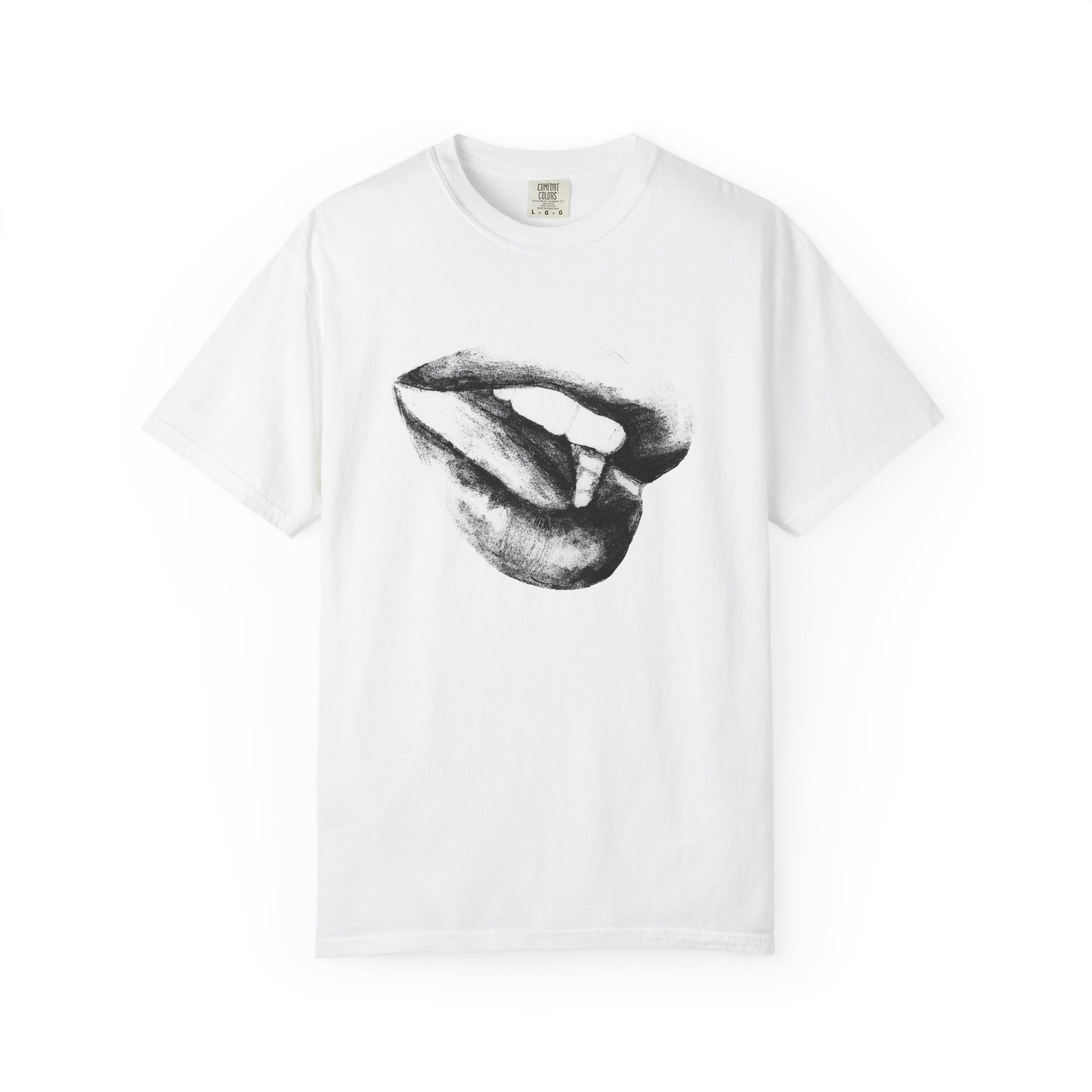 A comfortable and stylish unisex T-shirt featuring a BNW drawing of lush lips. This garment-dyed tee provides a relaxed fit and is made of 100% ring-spun US cotton for long-lasting comfort. Perfect for anyone looking for a unique and artistic addition to their wardrobe, especially those who appreciate minimalist designs. Great for casual wear or as a statement piece for art enthusiasts or fashion-conscious individuals. Ideal for gifting on birthdays, anniversaries, or as a trendy option for everyday wear.