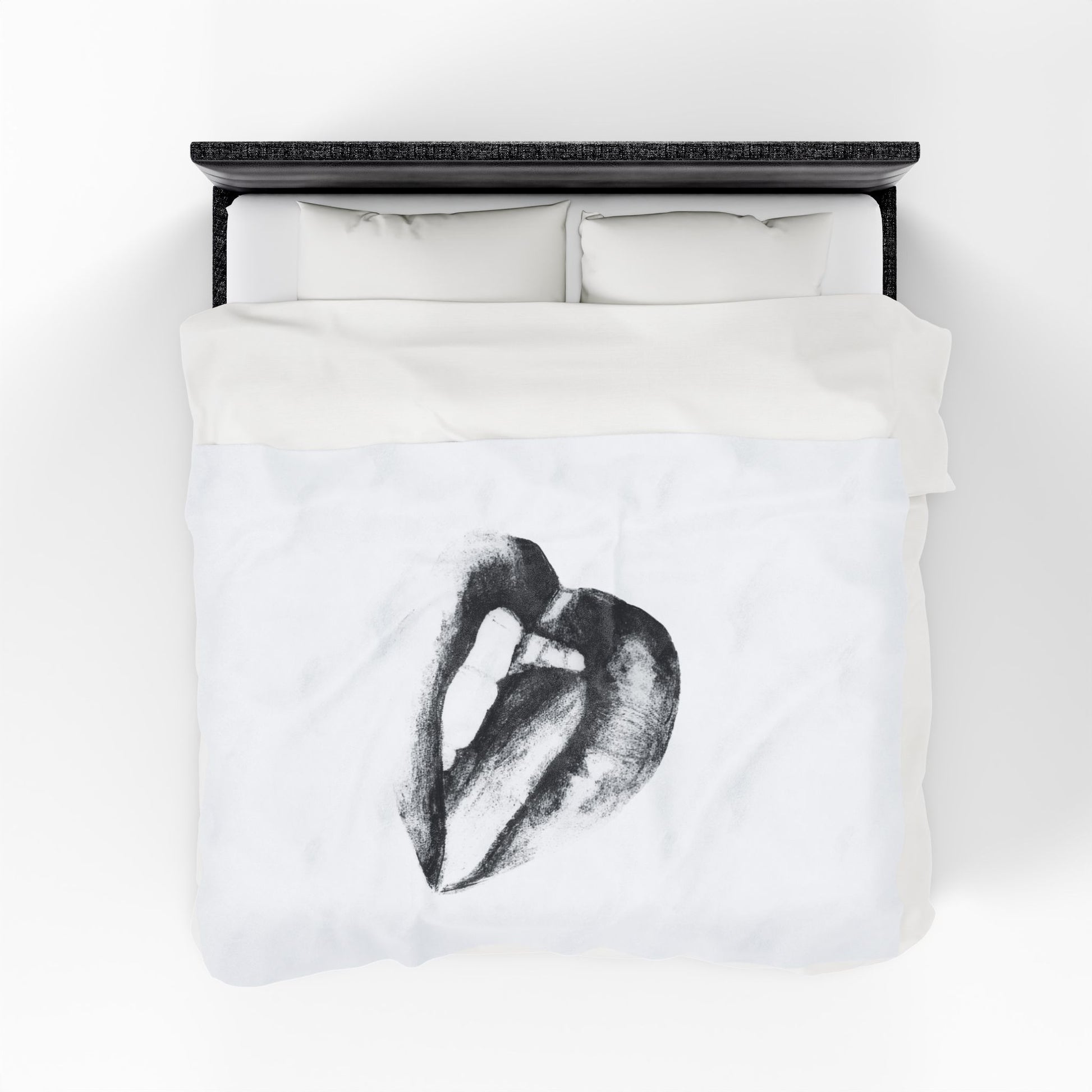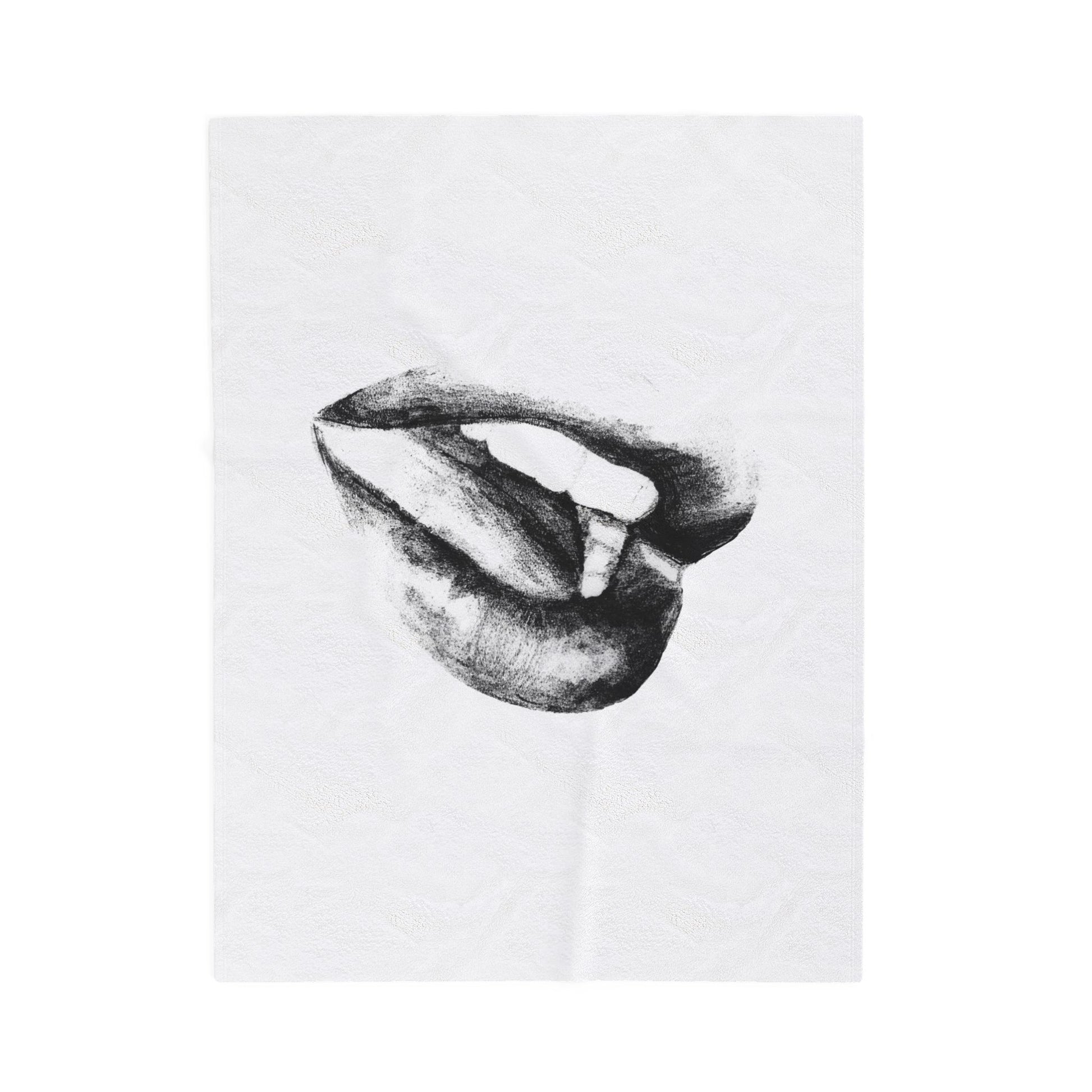 This velveteen plush blanket features a bold, sensual illustration of lips with teeth in a textured, sketch-like style. The design balances softness and intensity, creating a striking visual that feels both raw and elegant. Perfect for adults looking for a timeless and artistic addition to their home decor or as a thoughtful gift for art enthusiasts. Ideal for cozying up during colder seasons or as a statement piece for special occasions like Valentine's Day.